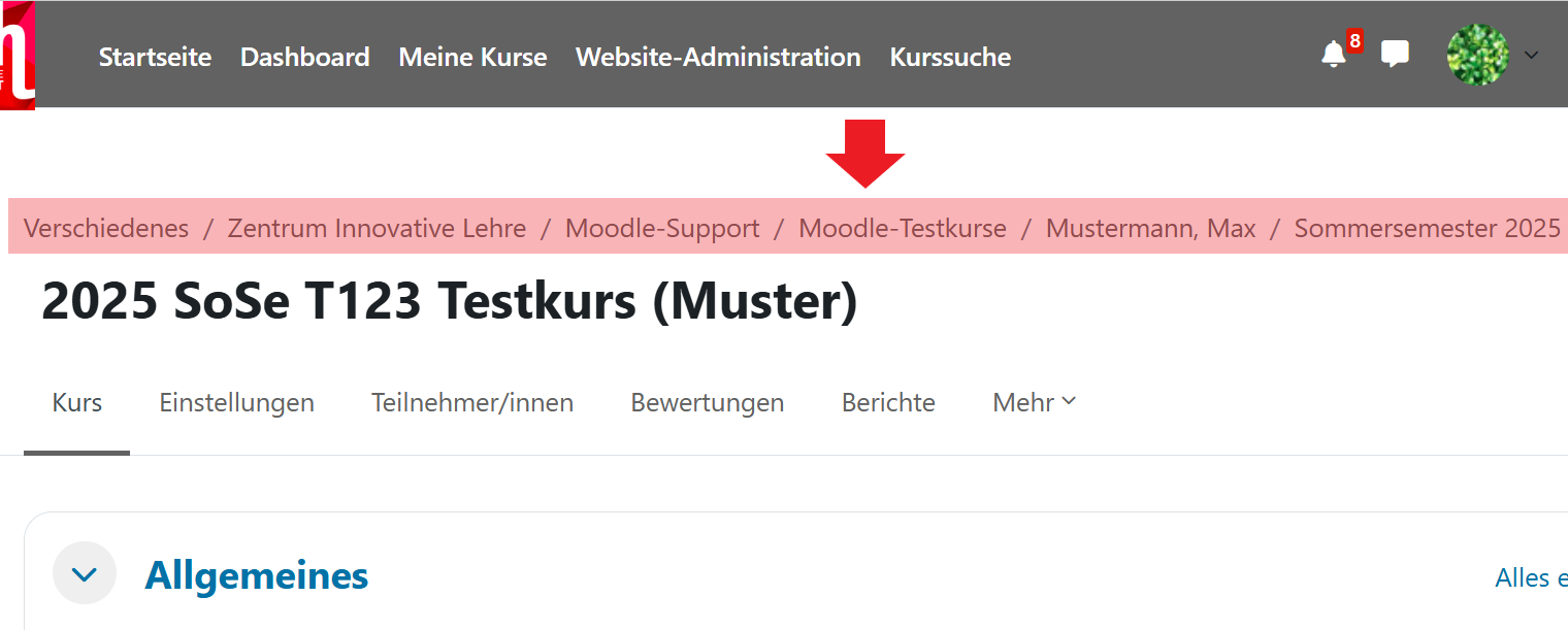 Zu Ihrem eigenen Kursbereich gelangen Sie am einfachsten über die sog. Breadcrumb in einem Ihrer Kurse.