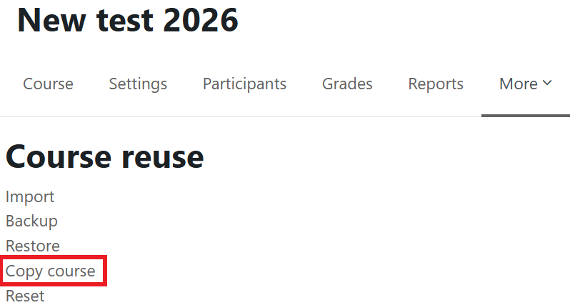 2. In the course, click on the More tab in the top menu and select Course reuse from the dropdown menu.