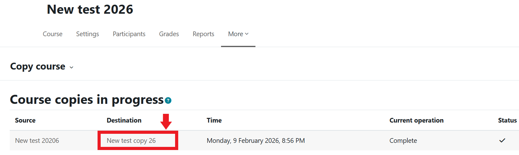 9. As soon as the copying is complete, a checkmark will appear and you can open the copied new destination course via the link under Destination.