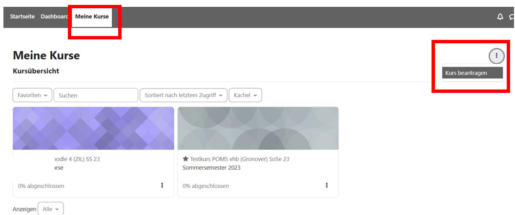 To offer your course materials in a „protected“ space, you must first request a so-called „course.“ When you are on the My Courses page, you can open the Request Form by clicking on „the three dots in the upper right corner.“