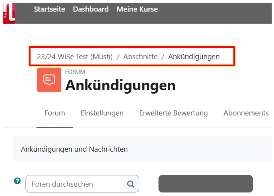 The so-called breadcrumb allows you to easily navigate within the course room. If you are in an activity, it helps you return to the main course page. Just click on the Short Course Name.