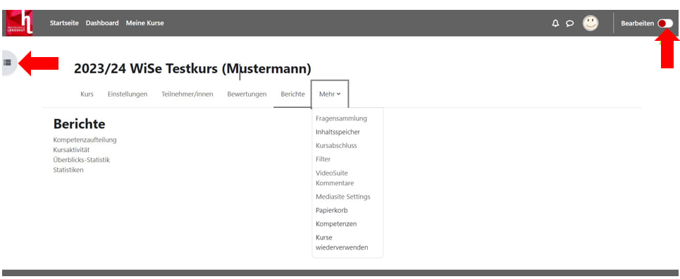 The central menu bar contains, among other things, editing functions (Settings) and user management (Participants) for you as the course instructor.