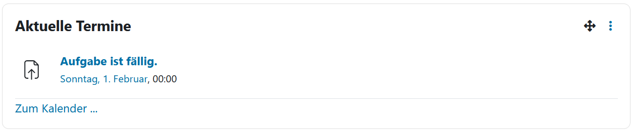 In diesem Abschnitt werden die bevorstehenden Abgabetermine und Fristen für verschiedene Lernaktivitäten angezeigt. Dies betrifft hauptsächlich Studierende. Manager*innen haben hier ebenfalls die Möglichkeit, die Aufgaben-Aktivitäten anzuzeigen, bei denen Bewertungen anstehen. Die Abgabetermine und Fristen können entweder nach Fälligkeit oder nach Datum bzw. Lernraum sortiert werden.