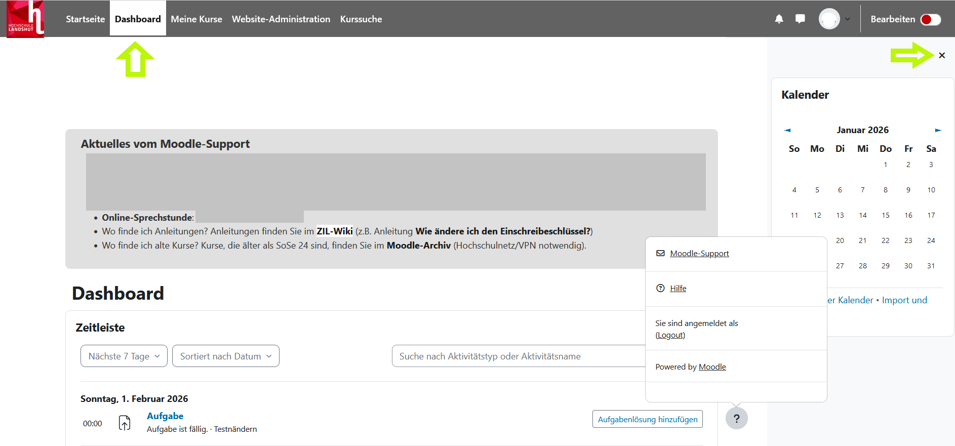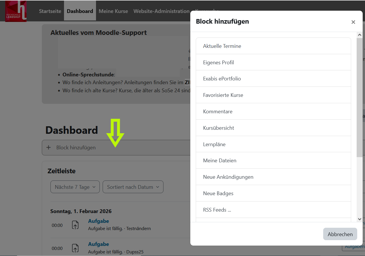 Dieser Block informiert die Lernenden über aktuelle Hinweise des Moodle-Supports und des Zentrums Innovative Lehre.