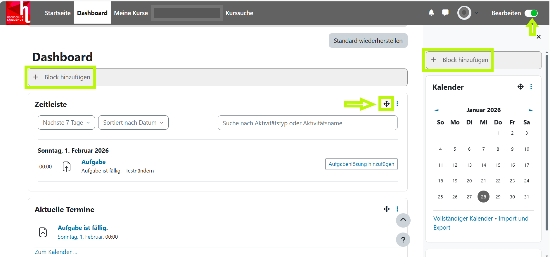 Alle Nutzenden könnten das Dashboard nach ihren Wünschen individuell konfigurieren und Blöcke verschieben, entfernen oder weitere Blöcke hinzufügen, die zusätzliche Informationen über die Lernräume bieten (Siehe II. Dashboard konfigurieren).