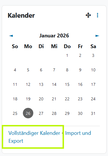 Falls Sie die entsprechenden Berechtigungen in einem Ihrer Lernräume besitzen, können Sie auch Gruppen- oder Kurstermine eintragen, die von anderen Nutzenden eingesehen werden können. Durch Klicken auf „Importieren und Exportieren“ im Kalender-Block können Sie außerdem Termine in den Kalender importieren oder aus diesem exportieren.