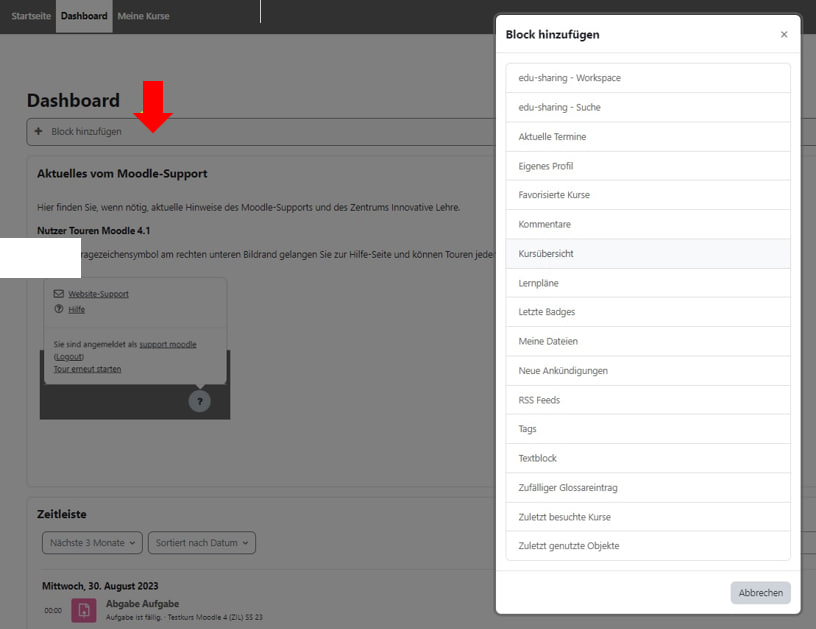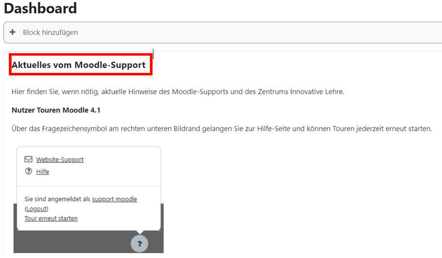 This block informs students about current information from Moodle Support and the Center for Innovative Educatio (nZentrums Innovative Lehre).