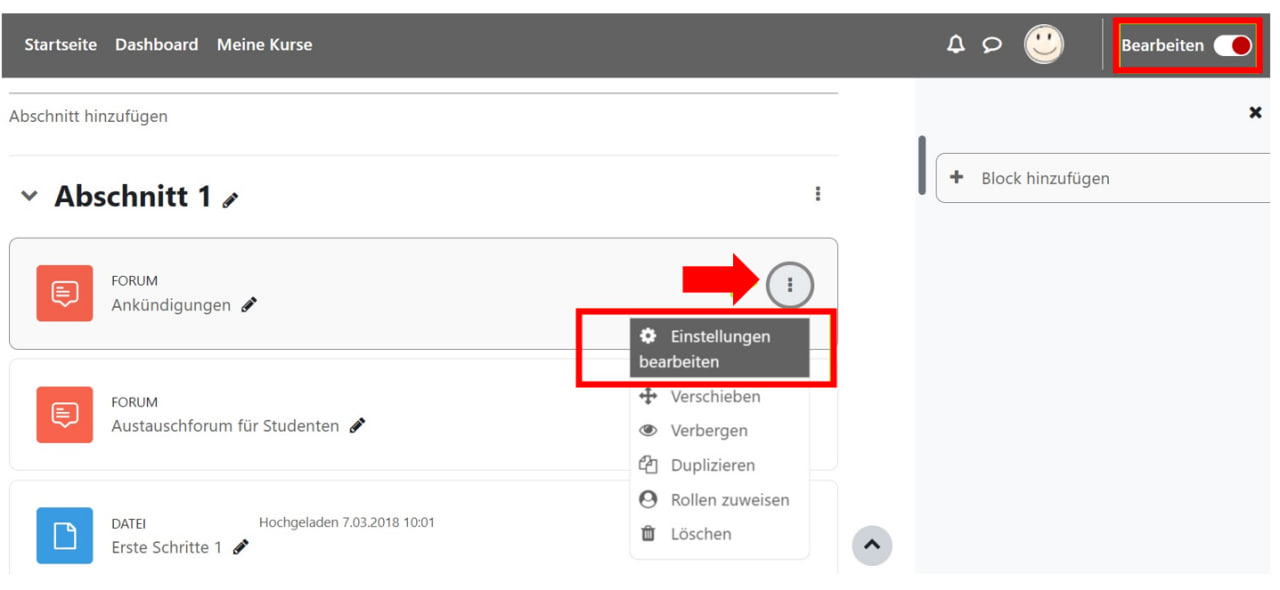 Once you have completed the preparations, you can start adding content and customizing the course room to your preferences. To do this, first enable editing mode by clicking the Turn Editing On button at the top right of the course homepage. Editing the course is only possible in this mode.