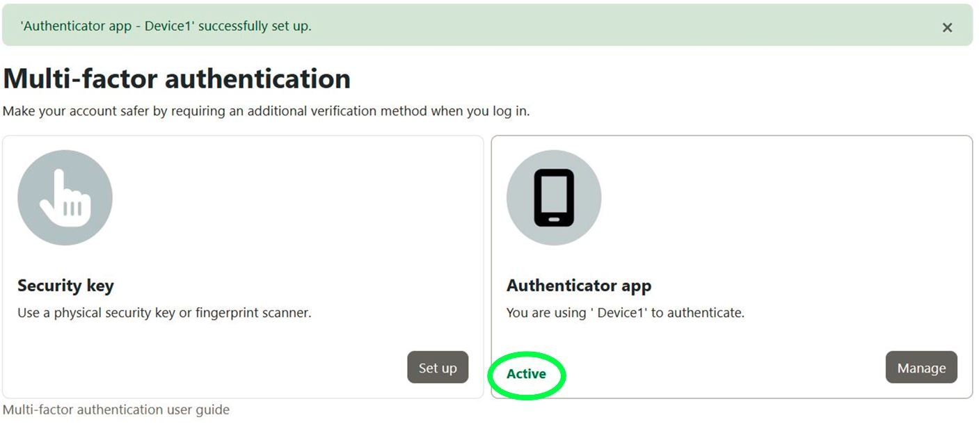 The second factor „Authenticator app“ is indicated by the green „Active“ status.