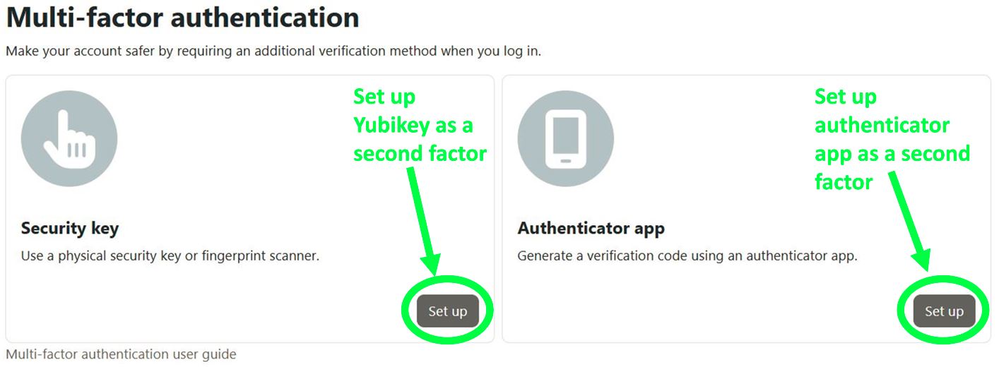 There are two options for the second factor: „Authentication token“ (= Yubikey) or „Authenticator app“. Choose one of the two factors.