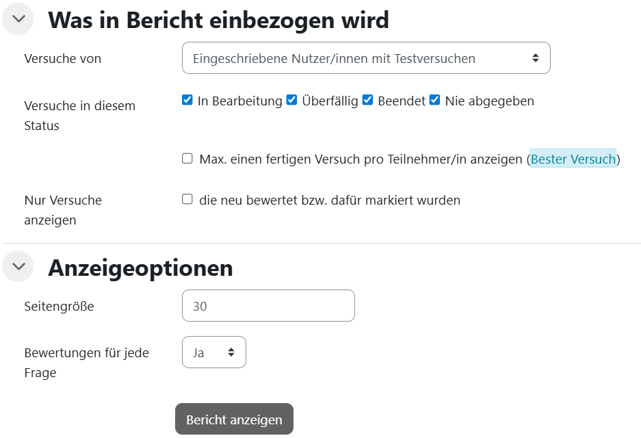 Sie können außerdem noch die Anzahl der anzuzeigenden Versuche reduzieren, wenn Sie entsprechende Optionen bei Versuche in diesem Status aktivieren bzw. deaktivieren und sich lediglich Versuche in Bearbeitung, Überfällige, Beendete oder Nie abgegebene anzeigen lassen oder Max. einen fertigen Versuch pro Teilnehmer/in anzeigen (Bester Versuch).