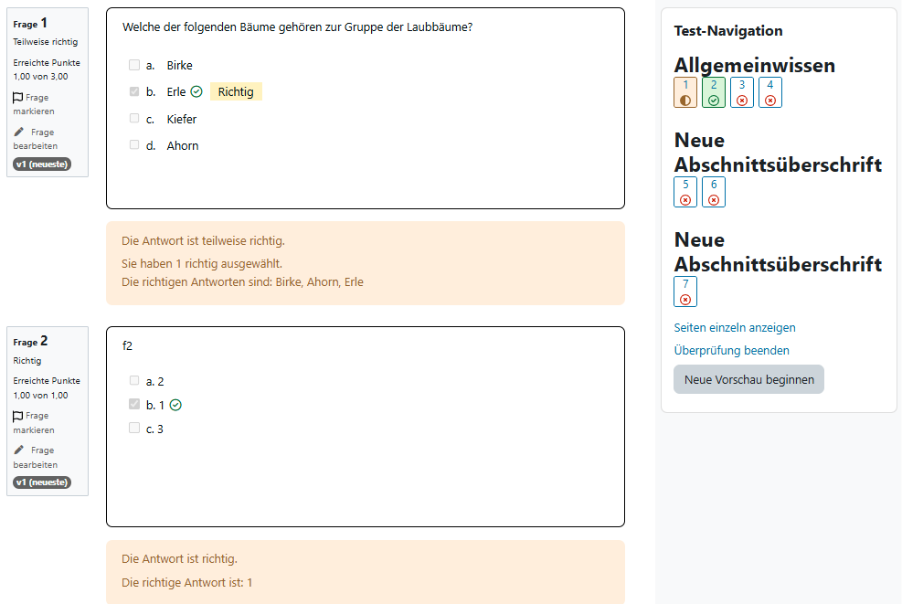 - die Fragen mischen lassen und sie somit in einer zufälligen Reihenfolge anzeigen lassen (pro Abschnitt einstellbar)