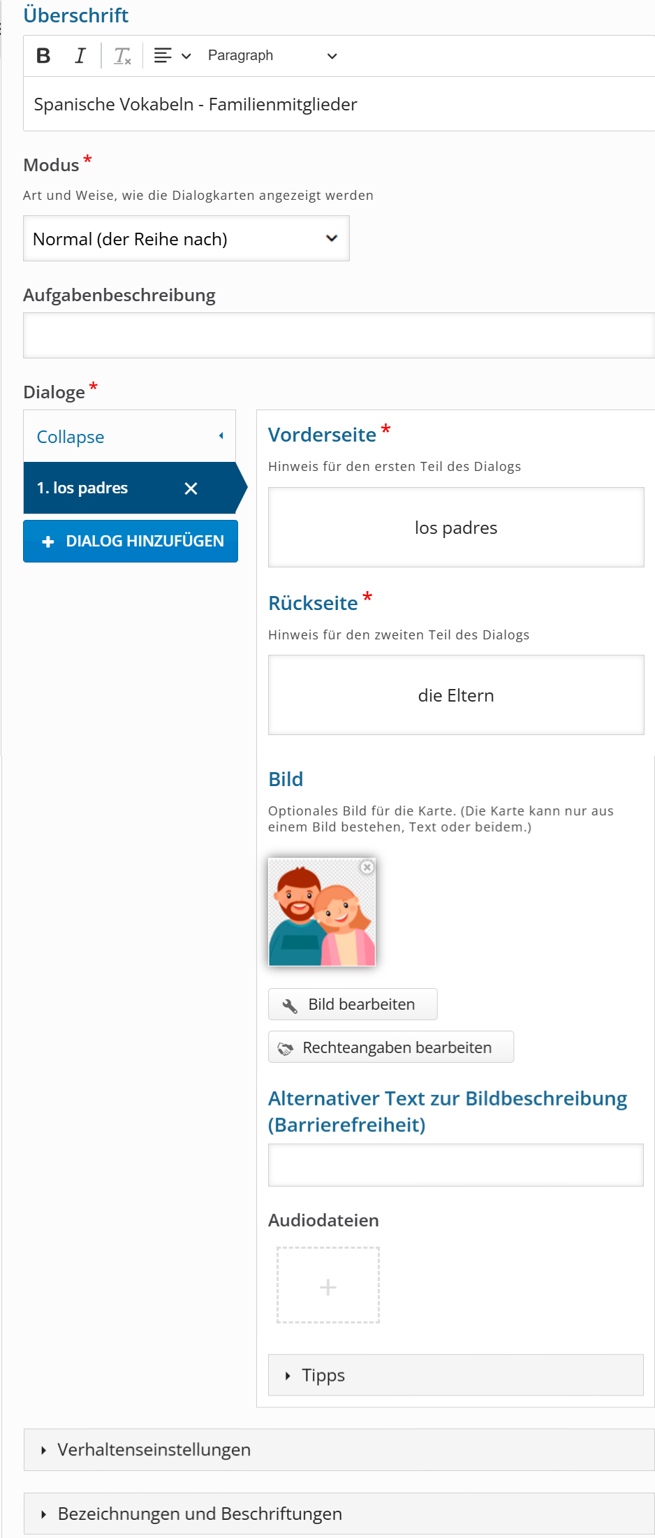 • In Tips, you can provide hints, and under Behavioral Settings, you can specify whether repetition is allowed.