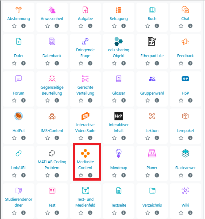 4. Im neuen Fenster sehen Sie eine Liste mit Aktivitäten. Scrollen Sie nach unten und klicken Sie auf Mediasite Content
