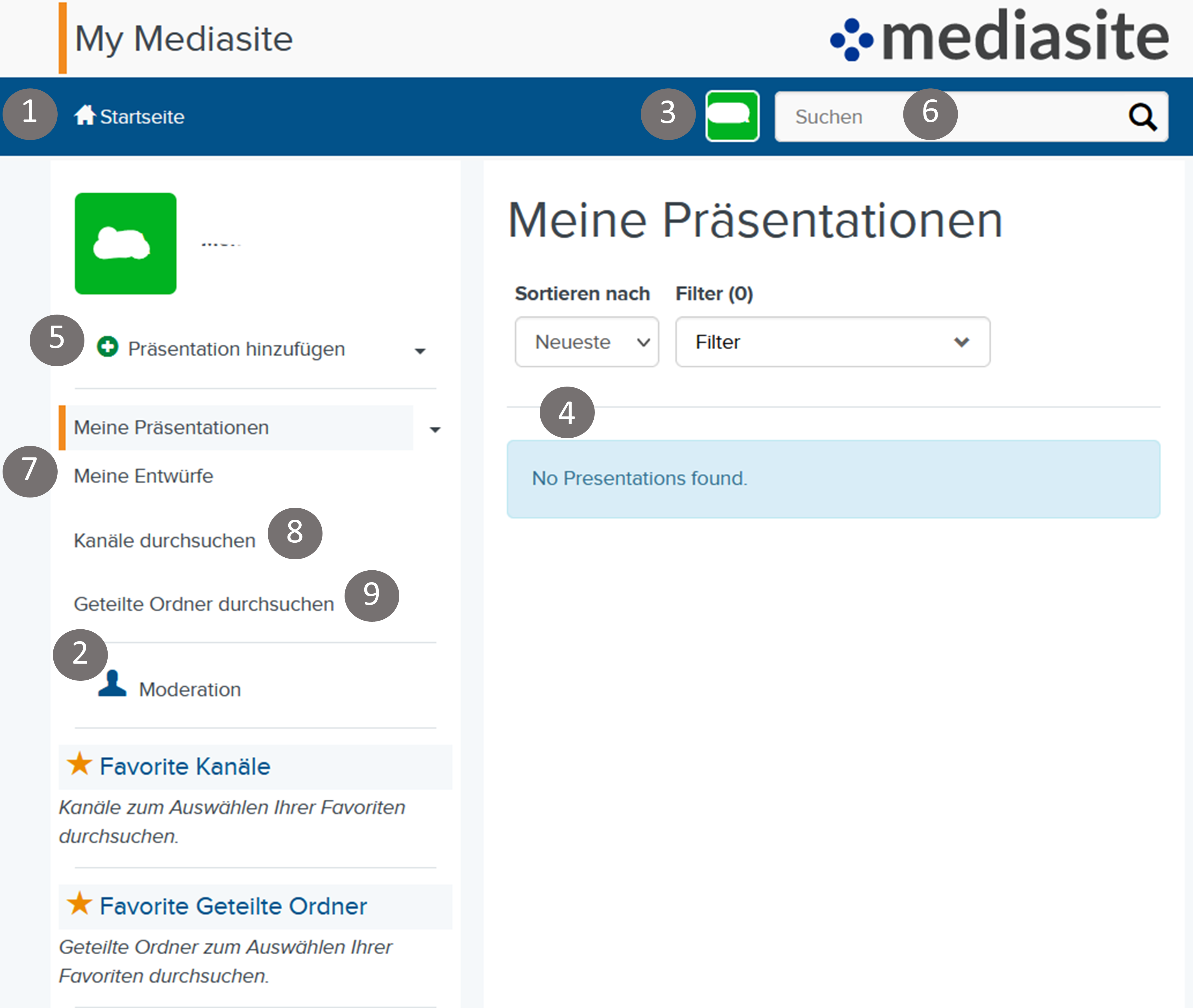 | 9 Geteilte Ordner | Unter GETEILTE ORDNER können Sie Medien mit anderen Mediasite-Nutzern teilen bzw. können Medien mit Ihnen geteilt werden. |
