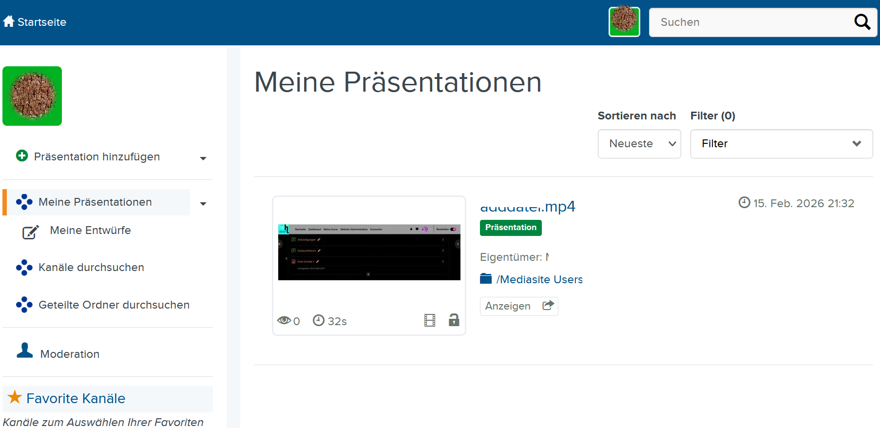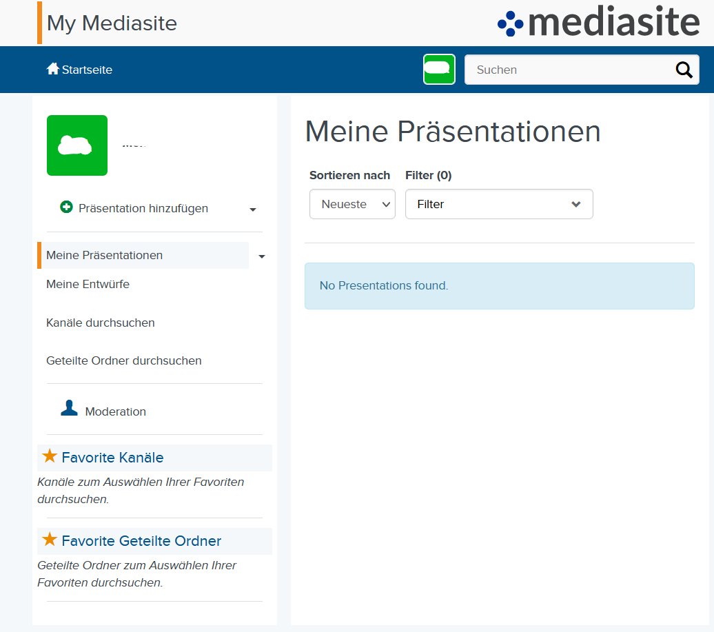 MyMediasite ist Ihre persönliche Medien-Plattform, die mit Mediasite und Moodle verbunden ist und es Ihnen ermöglicht, Medien (z.B. Vorlesungsaufzeichnungen, Präsentationsvideos) den Studierenden zur Verfügung zu stellen. Außerdem haben Sie die Möglichkeit, die Videos in Channels (Kanäle) zu strukturieren, was zu einer besseren Übersichtlichkeit dient.