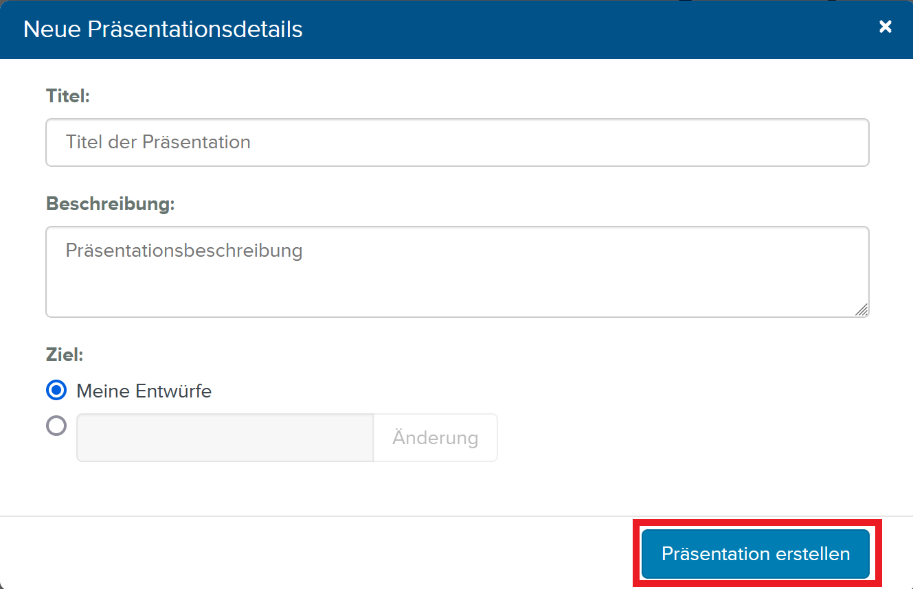 | 7 Meine Entwürfe | Bei der Erstellung von Präsentationen werden diese automatisch in MEINE ENTWÜRFE gespeichert. Diese ist dann für andere Nutzer/innen nicht sichtbar und kann weiterbearbeitet werden. |