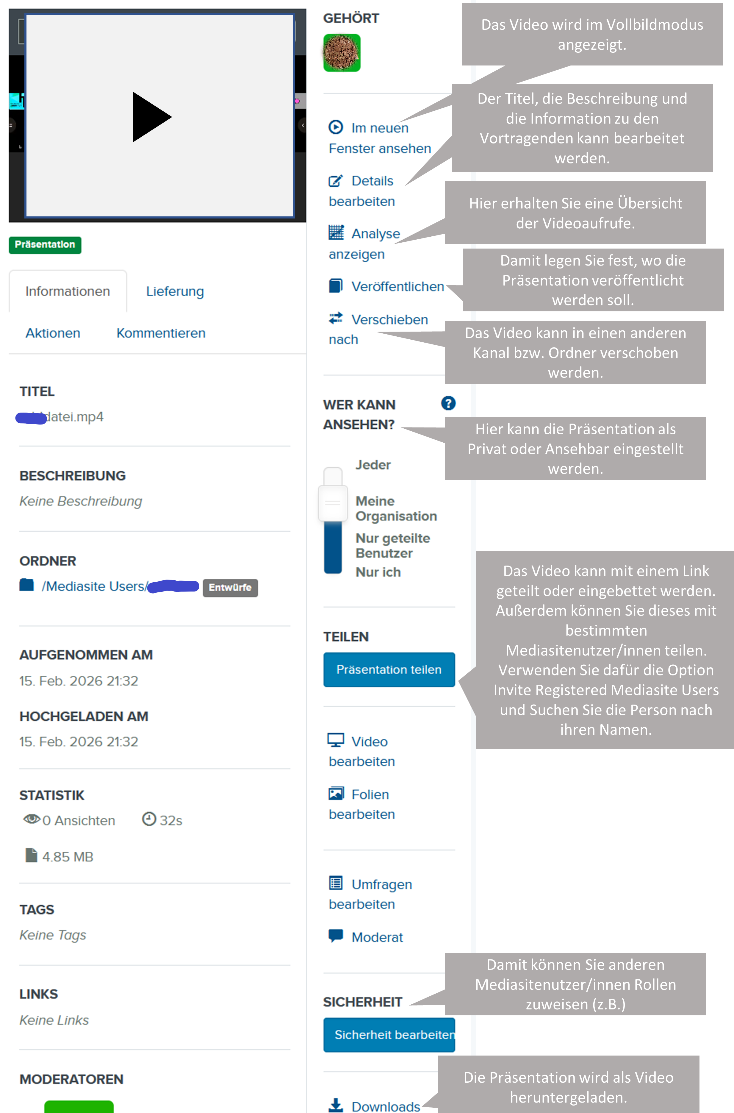 Beim Anklicken der Präsentation finden Sie unter dem Video Informationen zu dem Titel und der Beschreibung. An der Seitenleiste stehen Ihnen mehrere Einstellungsmöglichkeiten zur Verfügung. Besonders relevant sind folgende: